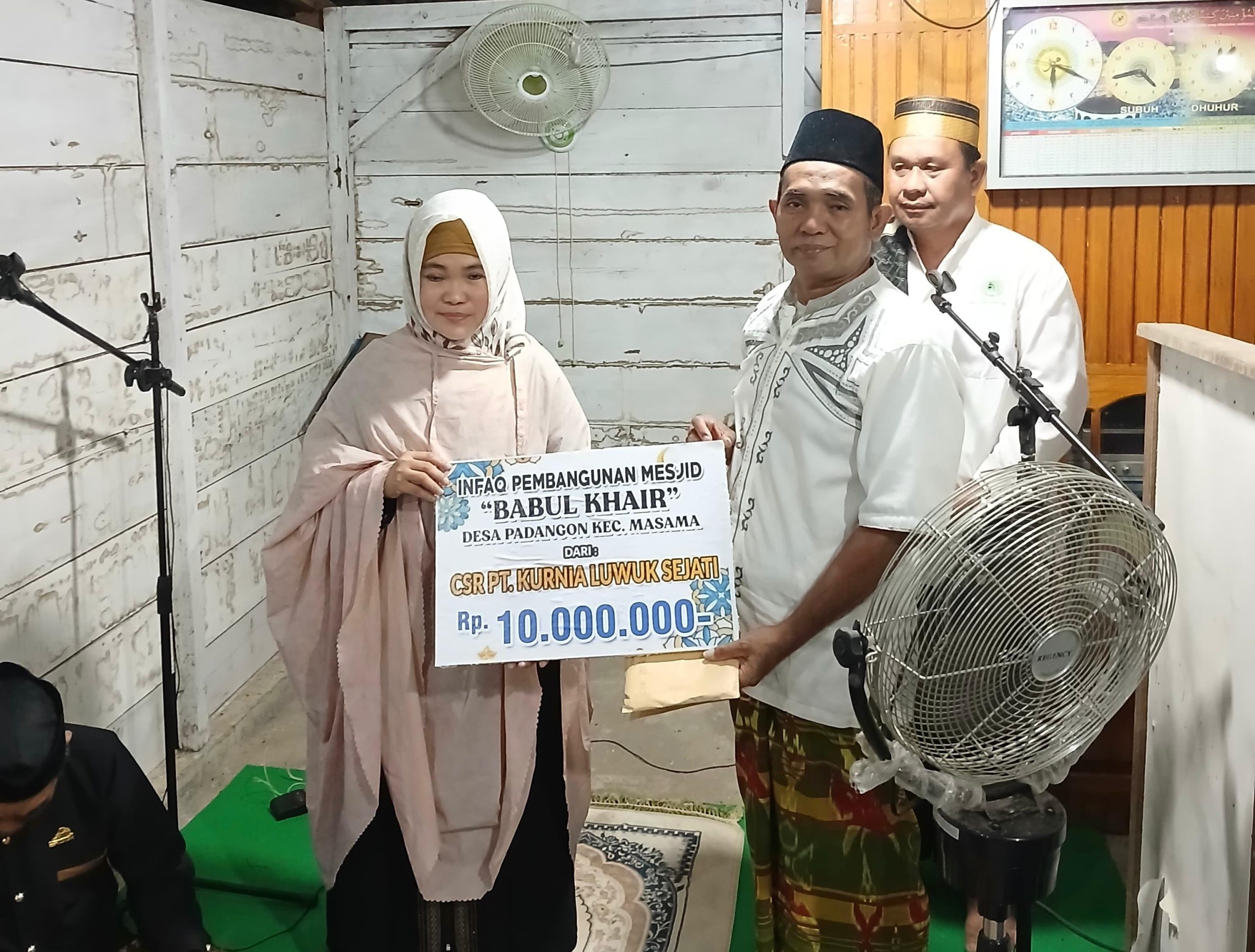 Usai menyampaikan sambutan, putri Almarhum H.Murad Husain ini mewakili keluarga, menyerahkan bantuan Corporate Social Responsibility (CSR) PT.KLS kepada panitia pembangunan Masjid Babul Khair sebesar Rp10 Juta.